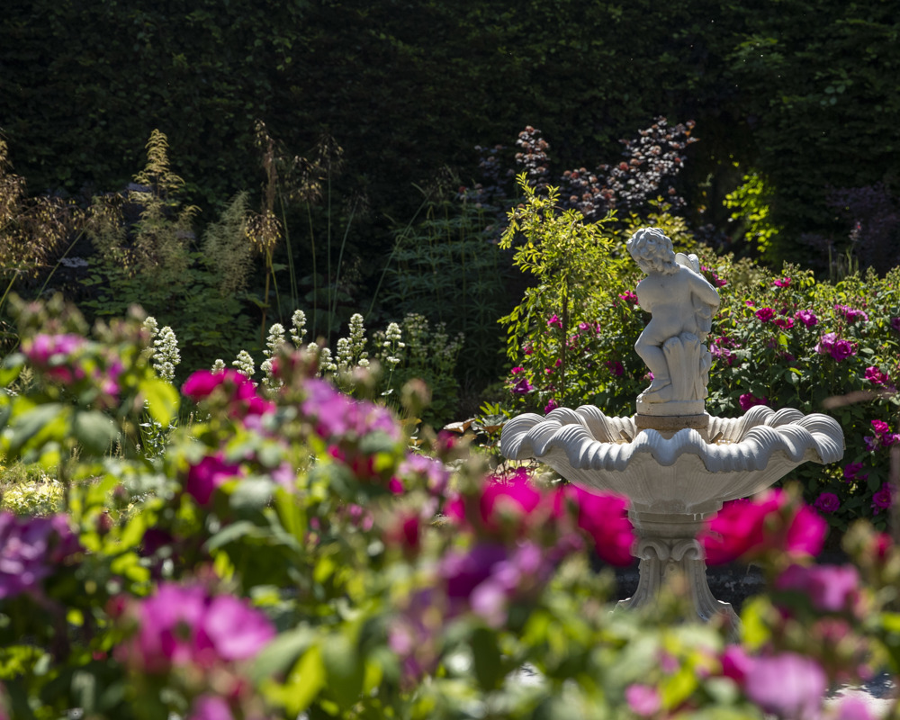 One of the first landmarks you encounter is the Rill Garden, a formal water feature that flows gently as the focal point at the front of the Hall. This rare example of prairie planting features a unique mix of North American grasses and perennials, adding a distinctive charm to the estate. The swaying movement of plants like hostas, asters and hydrangeas creates a tranquil atmosphere, while the vibrant addition of euphorbia and heuchera injects deep purple and vibrant hues into the landscape.