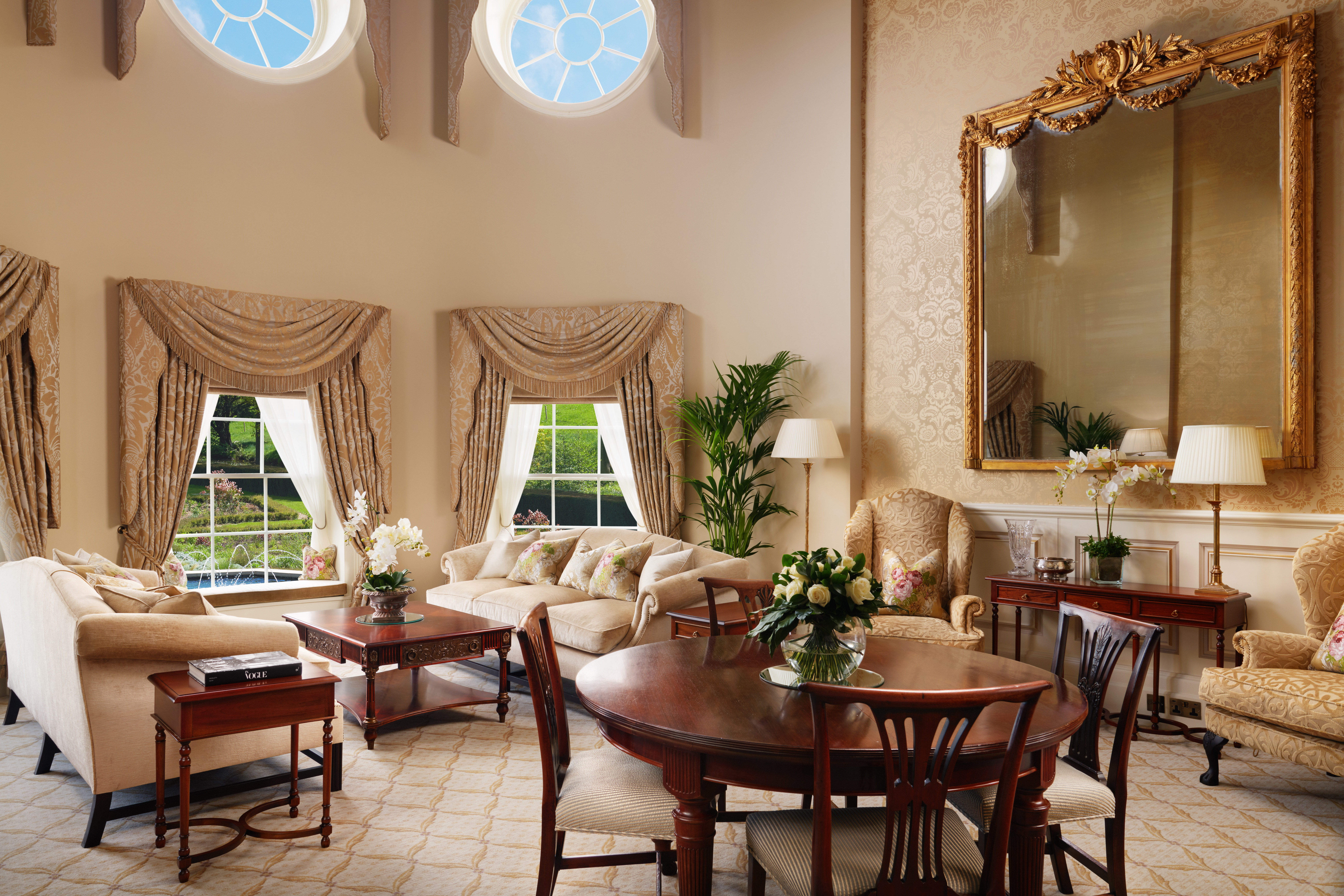 On the lower level, a spacious seating and dining area looks out over uninterrupted views of the sweeping formal gardens and picturesque River Skell. Relax in the elegant marble-clad bathroom and unwind in the roll top bath overlooking the manicured Rill Gardens. Meanwhile, the upper level features a mezzanine bedroom with a sumptuous emperor-sized bed, promising restful nights in a regal setting of unparalleled tranquillity.